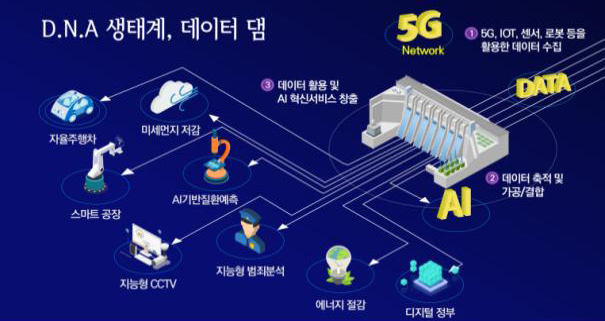 '데이터 댐'은 D.N.A 생태계의 핵심으로, 데이터 수집‧가공‧결합‧거래‧활용을 통해 데이터 경제를 가속화하고 5G 전국망에 기반하여 모든 산업에 5G와 AI 융합서비스를 확산하려는 사업이다.