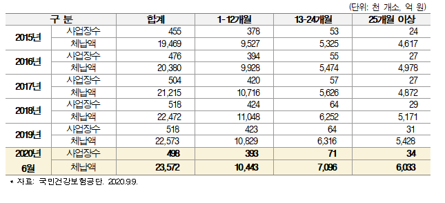 2015년 말 기준, 1천만 원 이상 체납한 사업장수는 43개, 체납액은 8,243억 원이었는데, 2020년 6월말 기준으로는 52개 사업장에 체납액이 9,872억원으로 매년 사업장수와 체납액이 증가하는 것으로 나타났다.