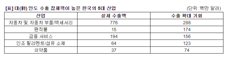 자동차 산업에 이어 인도 수출 잠재력이 있는 한국의 다른 산업 분야로는 편직물, 금융 서비스, 인조 필라멘트/섬유 소재, 의약품이 각각 뒤를 이었다.
