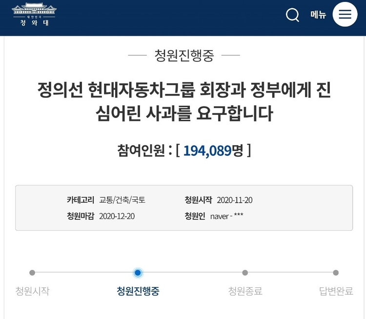 지난달 20일 청와대 청원 게시판에는 ‘정의선 현대자동차그룹 회장과 정부에게 진심어린 사과를 요구합니다’라는 제목의 청원글이 올라왔다.