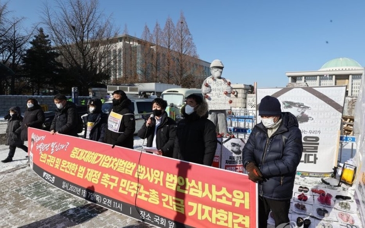 민주노총은 이날 서울 여의도 국회 앞에서 기자회견을 열어 "국회에서 논의가 진행되면 진행될수록 원안보다 후퇴한 결과만 들려온다"며 "온전한 중대재해기업처벌법 제정을 위해 재논의 절차에 들어가라"고 촉구했다.