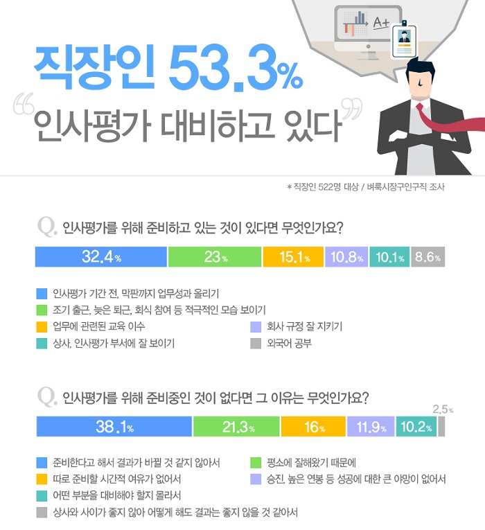 9일 벼룩시장구인구직이 직장인 522명을 대상으로 설문조사를 진행한 결과, 응답자의 53.3%가 ‘인사고과에서 좋은 평가를 받기 위해 준비하고 있다’고 답한 것으로 집계됐다.
