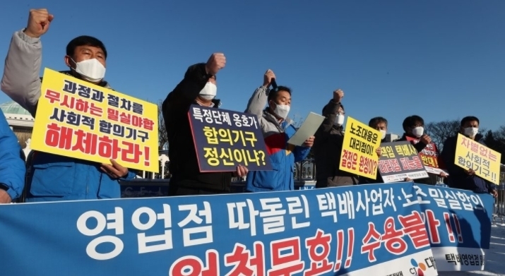 이 단체는 "대리점연합회를 배제한 합의는 수용할 수 없다"며 합의 무효 요구가 받아들여지지 않을 경우 오는 17일로 예정된 사회적 합의기구 2차 회의에 불참하고 집화를 거부하겠다고 발표.