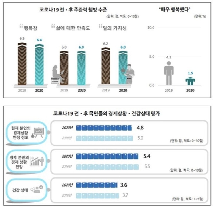 【 청년일보 】우리나라 국민의 경제 상황 인식이 신종 코로나바이러스 감염증(코로나19)로 인한 재난으로 악화되면서 이전보다 덜 행복해졌다는 조사결과가 나왔다.