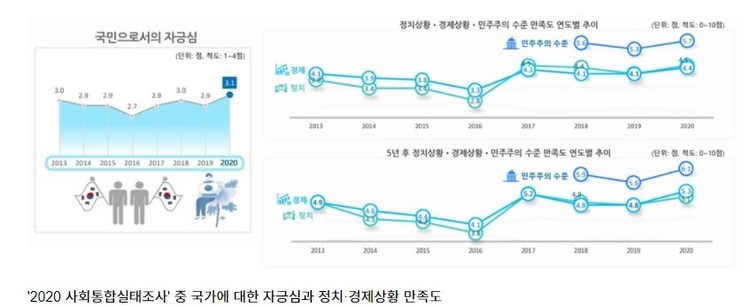 우리나라의 정치상황과 경제상황, 민주주의 수준에 대한 만족도 역시 10점 만점에 각각 4.5점, 4.4점, 5.7점으로 조사 시작 이후 가장 높은 수준을 기록했다.