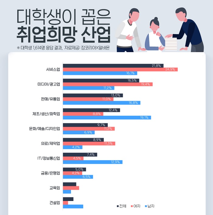 가장 취업하고 싶어하는 산업으로는 △서비스업(21.8%) △미디어/광고업(16.5%) △판매/유통업(13.0%) 등으로 나타났다.