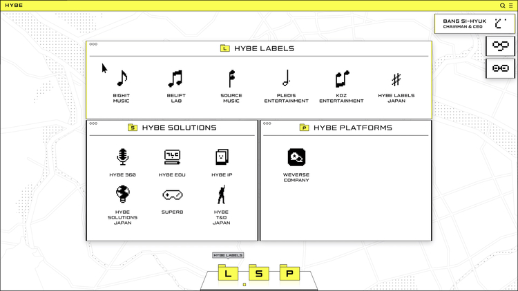 레이블 영역에는 빅히트 뮤직과 빌리프랩, 쏘스뮤직, 플레디스 엔터테인먼트, KOZ 엔터테인먼트, 하이브 레이블즈 재팬이 포함된다.