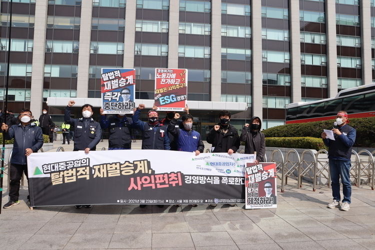 전국금속노동조합 현대중공업지부는 23일 서울 종로구 계동 현대사옥 앞에서 '현대중공업의 탈법적 재벌 승계, 사익편취 경영방식 폭로 기자회견' 진행.