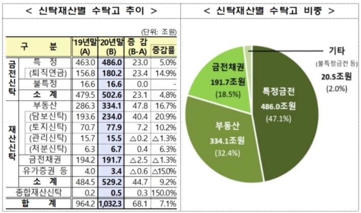 신탁 재산별로 보면 금전신탁은 502조6천억원으로 겸영 신탁회사의 퇴직연금 신탁과 수시입출금신탁을 중심으로 4.8% 늘었고, 재산신탁은 은행과 부동산신탁사의 부동산 담보신탁을 중심으로 9.2%(44조7천억원) 늘어난 529조2천억원으로 집계.