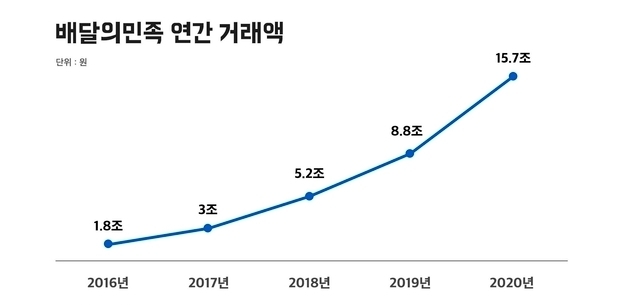◆ 코로나로 작년 배달의민족 매출 2배 증가...거래액 15조 돌파