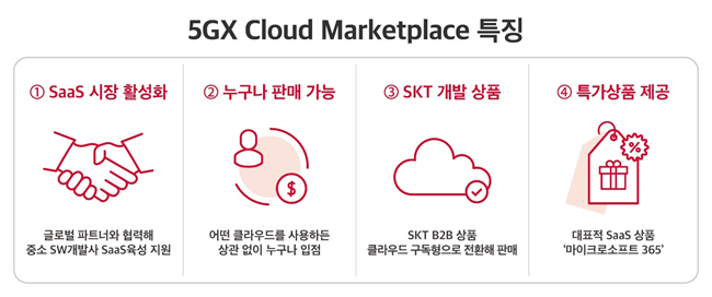 SKT는 글로벌 클라우드 파트너사와 협력해 5GX 클라우드 마켓플레이스를 통해 SaaS화를 희망하는 국내 중소 소프트웨어 개발사에게 클라우드 교육 무상 제공, 클라우드 마켓 수수료 3개월 면제, 클라우드 전용 크레딧 최대 500만 원 등의 혜택을 제공한다.