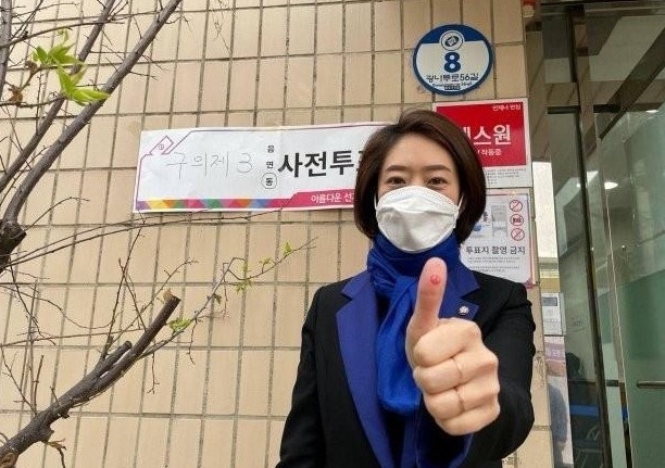 【 청년일보 】더불어민주당 고민정 의원이 2일 서울시장 보궐선거 사전투표에 참여한 후 촬영한 '인증샷' 사진이 논란이 됐다.