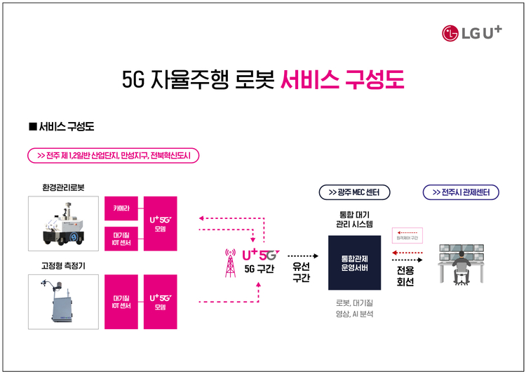 앞서 LG유플러스는 작년 9월 전주시와 업무협약을 맺은 뒤 24시간 대기질을 측정하고 오염물질 배출을 감시할 수 있는 자율주행로봇을 도입하기로 했다. 전주시 팔복동 산업단지와 만성지구, 혁신도시 등 주거지역에 자율주행 로봇 6대와 고정형 대기측정기 20기를 투입했다.