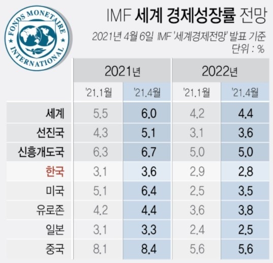 이는 지난 1월 발표한 직전 전망치(5.5%)보다 0.5%포인트 올라간 수치로 IMF는 선진국의 올해 성장률 전망치는 5.1%, 신흥·개도국은 6.7%로 각각 상향 조정했다.