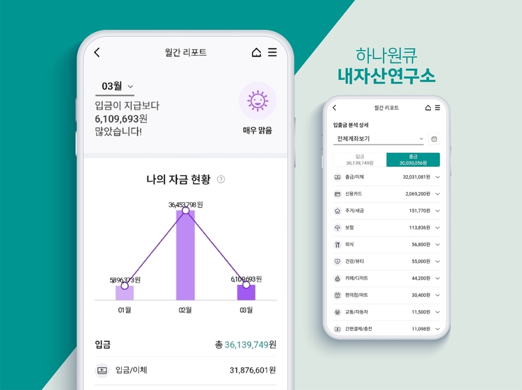 하나원큐 앱 내 '내자산연구소'에서 살펴볼 수 있는 하나 자금관리 리포트는 손님의 월간 거래를 분석해 월별 잉여자금산출, 입출금 거래 분석, 출금 성향 분석 등 개인화된 리포트를 매월 초 제공한다.