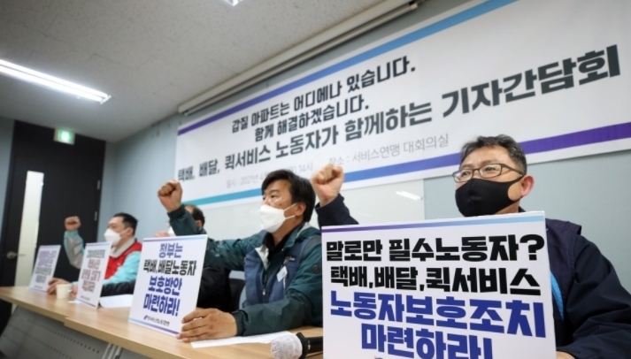 민주노총 전국서비스산업노동조합연맹은 26일 기자간담회를 열고 "사회적 갈등으로 대두된 일부 아파트의 도보 택배 배송 문제는 택배 노동자만의 문제가 아니다"라며 "택배·배달·퀵서비스 노동자들은 공동 투쟁을 통해 갑질 아파트 문제를 완전히 해결하고자 한다"고 발표.