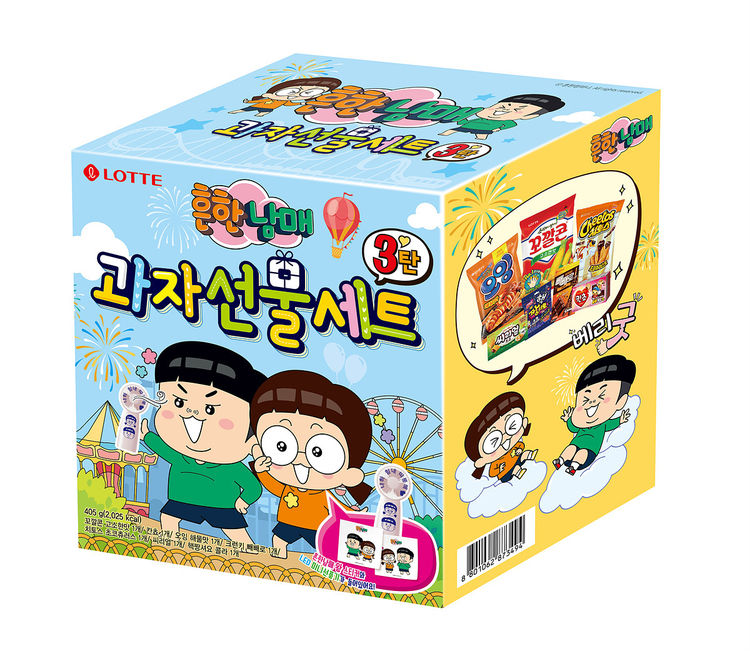 롯데제과X흔한남매 과자선물세트 3탄은 치토스, 오잉, 꼬깔콘, 씨리얼, 칸쵸 등 인기 제품 7종으로 구성됐다. 더불어 전원을 켜면 돌아가는 선풍기의 날개에 LED로 특정 글자가 나오는 미니 선풍기와 '흔한남매'의 캐릭터 이미지가 전면에 들어가 크게 만들어진 스티커 2종도 함께 들어있다.