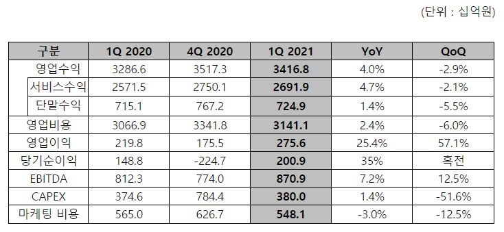 LG유플러스는 2021년 1분기 매출 3조 4168억 원, 영업이익 2756억 원을 달성했다. 전년 동기 대비 매출은 4.0%, 영업이익은 25.4% 증가했다.