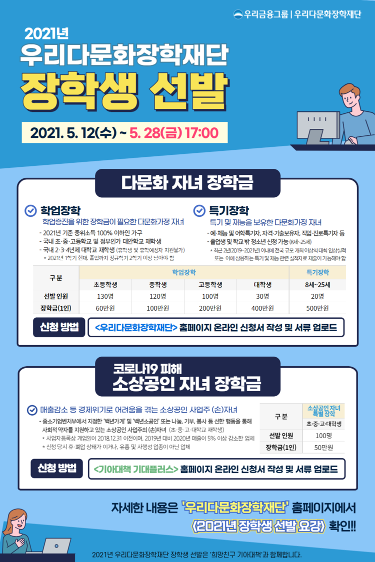 또한 코로나19로 인해 2019년 대비 2020년 매출이 5% 이상 하락해 어려움을 겪는 소상공인 자녀 100명을 대상으로 ‘특별장학금’도 지원된다.