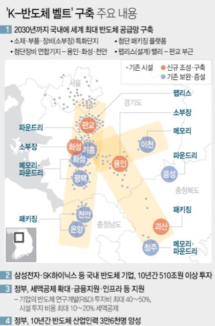 기업들과 함께 국내에 세계 최대·최첨단 반도체 공급망을 만들겠다는 사업 전략은 판교와 기흥~화성~평택~온양의 서쪽, 이천~청주의 동쪽이 용인에서 연결돼 'K자형' 모양을 띤다. 정부는 이를 'K-반도체 벨트'라고 명명했다.