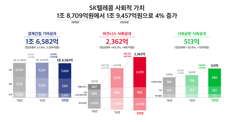 그 결과 2020년 '비즈니스 사회성과'는 2362억 원으로 전년 대비 60.2% 증가했고 '사회공헌 사회성과'도 513억 원으로 전년 대비 33.9% 증가했다. '경제간접 기여성과'의 경우 자사주 매입 등의 영향으로 1조 6582억 원을 기록하며 소폭 감소(△1.6%)했다.