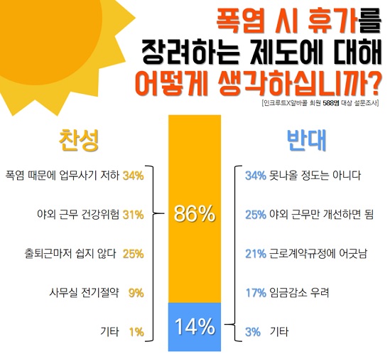 30일 인크루트가 직장인 496명을 대상으로 설문조사를 실시한 결과 직장인 86%는 '폭염 시 휴가를 장려하는 제도'에 대해 찬성하는 것으로 집계됐다. 반대의견은 14%에 불과했다.