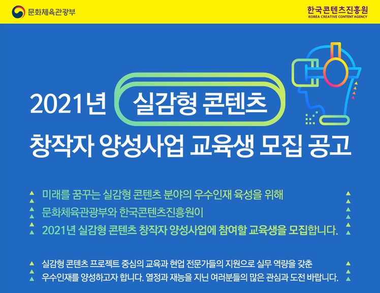 【 청년일보 】 문화체육관광부와 한국콘텐츠진흥원은 '2021년 실감형 콘텐츠 창작자 양성사업'에 참여할 140여 명의 교육생을 오는 6월 4일까지 모집한다.
