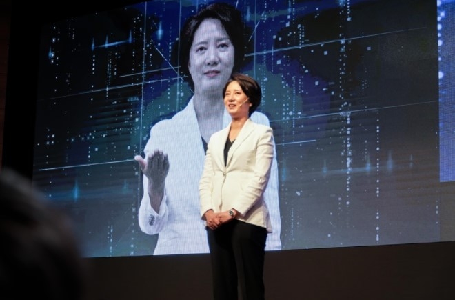최고위원에 출마한 이영 의원은 'AI(인공지능) 이영'과 함께 무대를 꾸몄다. 전광판 영상 속 AI 이영은 "국민의힘을 미래로 이끌기 위해 열심히 공부하고 있다"고 소개.