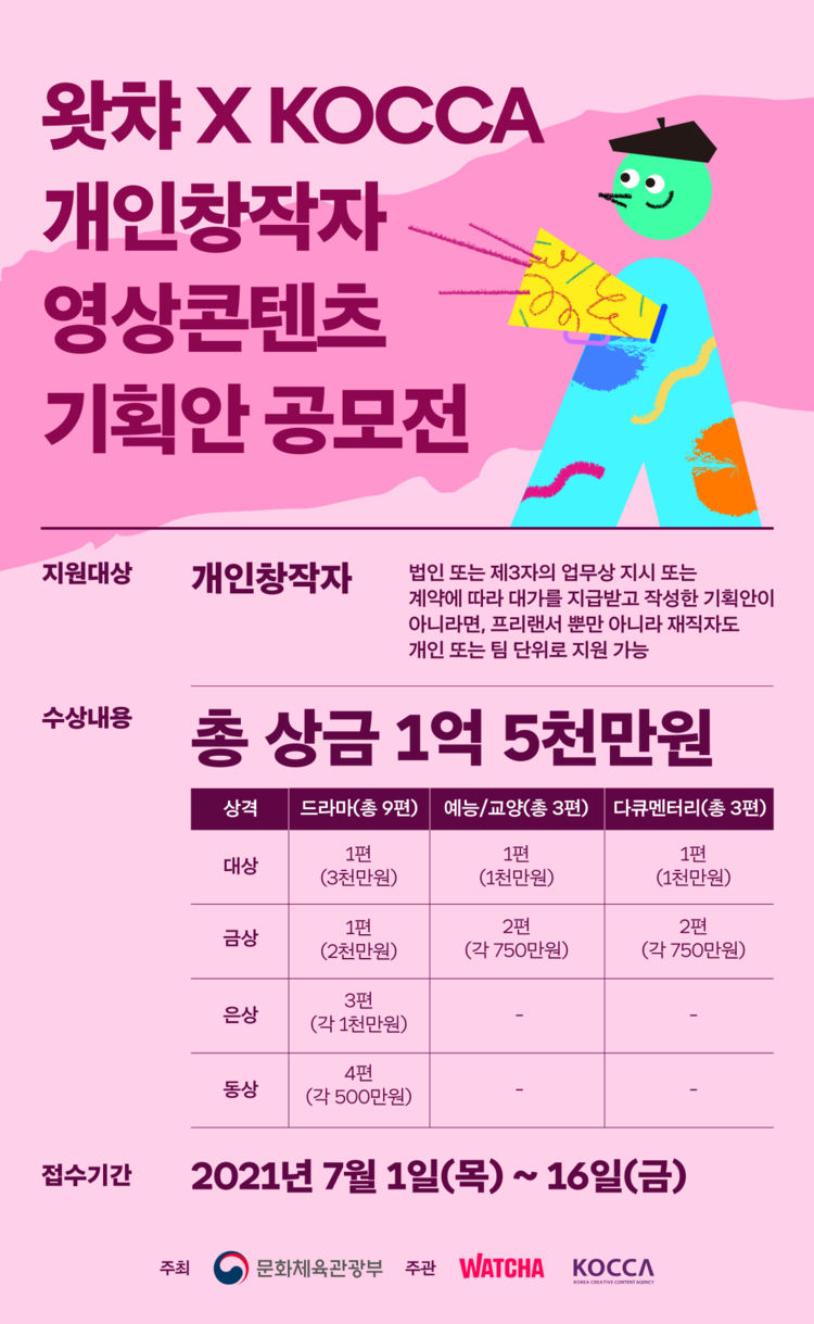 【 청년일보 】 문화체육관광부와 한국콘텐츠진흥원은 국내 OTT 플랫폼 왓챠와 독창적인 기획안을 발굴하고자 창작자 대상 공모전을 개최하며, 선정된 우수작은 왓챠 오리지널 콘텐츠로 제작해 연계 지원한다.