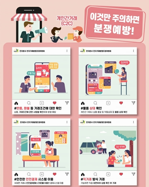 이에 한국인터넷진흥원(KISA)은 당근마켓·번개장터·중고나라 등 개인간거래(C2C) 플랫폼 사업자와 함께 반품·환불 등 거래조건 확인, 물품 상태 확인, 안전결제 시스템 이용, 직거래 방식의 거래 권고 등 캠페인을 벌이기로.