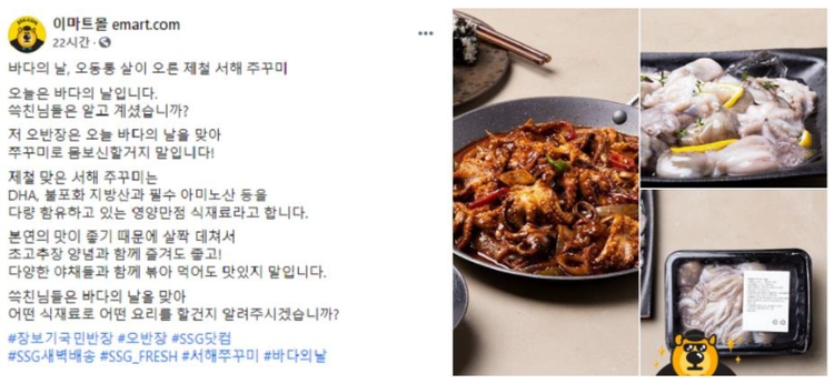 아울러 SSG닷컴은 전날 이마트몰 공식 페이스북 및 인스타그램 계정에 주꾸미 판매 관련 게시글을 올렸는데, 바다의날을 기념해 주꾸미 요리를 추천하는 내용 속에 첨부된 사진에는 주꾸미 상품이 생물로 표기.