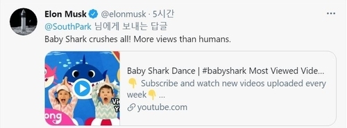 이날 일론 머스크 테슬라 최고경영자(CEO)는 자신의 트윗에 “아기상어가 모든 것을 부쉈다.인간보다 더 많은 뷰를 남겼다.(Baby Shark crushes all! More views than humans)”라는 글을 남기며 아기상어 동영상 링크를 올렸다.