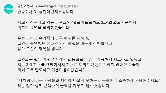 해당 유튜브 채널은 전날 공지를 통해 "프로젝트 의뢰인 A씨가 며칠 전 유명을 달리해 고인이 출연한 온라인 영상 클립을 비공개 전환한다"고 밝혀.