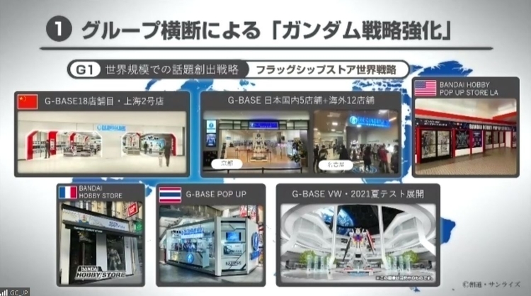 건담 플래그십 스토어도 확대한다. 중국과 미국, 프랑스 등으로 건담베이스를 확대하고, 가상현실을 통해 만나는 버추얼 스토어의 테스트도 올여름부터 시작한다.