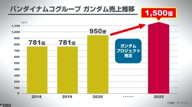 2020년 기준 건담 관련 매출은 950억 엔(한화 약 9639억 3650만 원)을 기록했다. 반다이남코는 건담 프로젝트 발족을 통해 2025년까지 1500억 엔(한화 약 1조 5220억 엔)까지 끌어올리는 것을 목표로 삼았다.