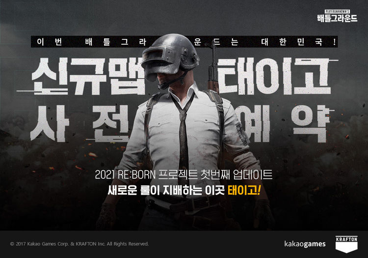 태이고 사전예약은 카카오 배틀그라운드 이용자라면 누구나 공식 홈페이지를 통해 신청이 가능하며 22일과 26일에 각각 공개되는 한국 맵 관련 티저 영상을 통해 추가 정보를 확인하고 보상도 얻을 수 있다.