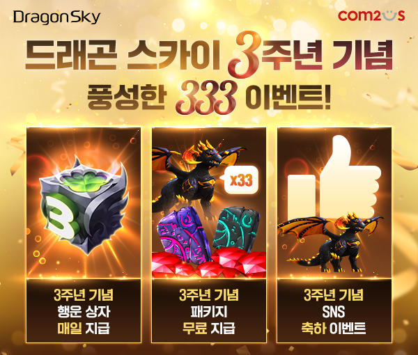 333 이벤트는 유저에게 다양한 혜택을 제공하는 3가지 이벤트로 구성됐다. 먼저, 내달 5일까지 최대 7개의 행운 상자를 받는 '3주년 기념 행운 상자' 이벤트가 진행되며, '3주년 기념 패키지' 이벤트를 통해 '빛나는 10단계 드래곤' 33마리 등 다양한 아이템을 무료로 지급한다.