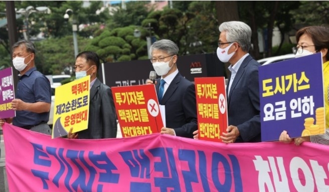 '투기자본 맥쿼리의 해양에너지 인수 저지와 도시가스 요금 인하를 위한 시민대책위원회'는 6일 서울 종로구 맥쿼리인프라 앞에서 기자회견을 하고 "정부와 국회는 필수적 공공재의 통제 방안을 강화하라"고 촉구.