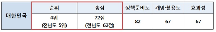평가 결과 우리나라는 지난해 총점 62점에서 올해 72점으로 10점 상승 하는 등 2013년 첫 평가 후 매년 점수가 상승했다.