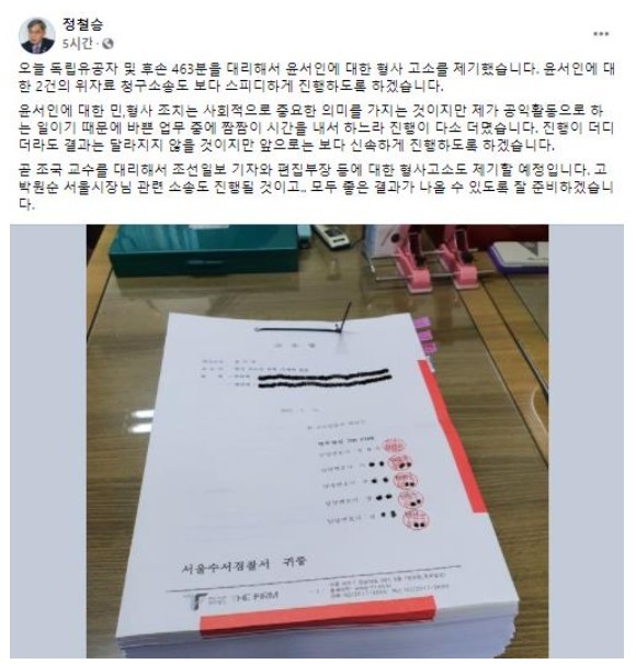 정철승 변호사는 12일 사회관계망서비스(SNS)에 "오늘 독립유공자 및 후손 463분을 대리해서 윤서인에 대한 형사 고소를 제기했다"고 밝혀.