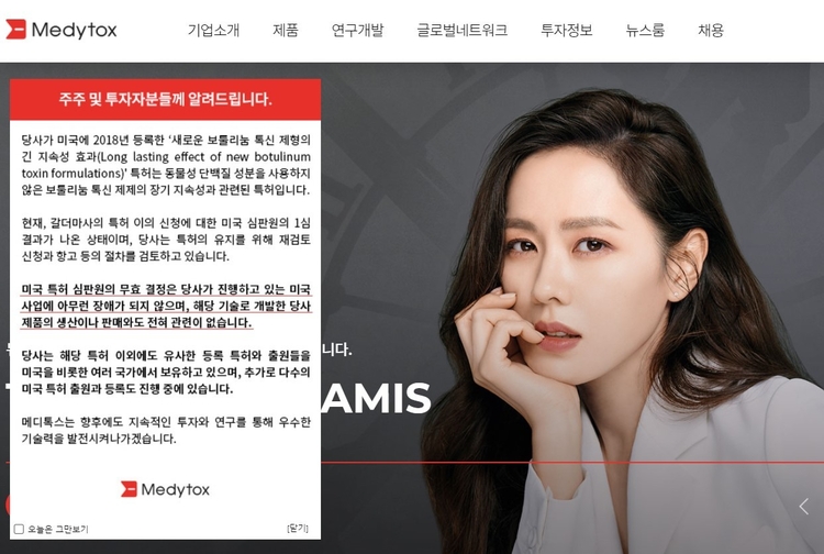 아울러 메디톡스는 "갈더마의 특허 이의 신청에 대한 미국 특허심판원의 1심 결과가 나온 상태"라며 "특허 유지를 위해 재검토 신청과 항고 등의 절차를 검토하고 있다"고 덧붙였다.