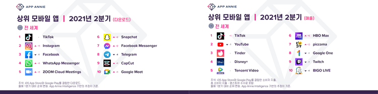 2021년 2분기 전 세계 상위 앱은 주로 소셜, 메시지, 비디오 스트리밍 앱으로 구성된 것으로 확인됐다. 다운로드 및 소비자 지출은 모두 '틱톡'이 1위를 차지했다.