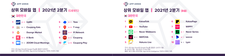 2분기에는 전 세계적으로 백신 접종과 코로나19의 완화로 여행 및 내비게이션 앱이 회복하는 모습을 보였는데, 한국도 같은 맥락에서 '티맵'이 7위를 차지했다. 가상화폐 '파이코인'을 무료로 채굴하는 앱 '파이 네트워크'는 8위에 올랐으며 쿠팡의 OTT 서비스 '쿠팡플레이'는 36계단 상승해 10위에 안착했다.