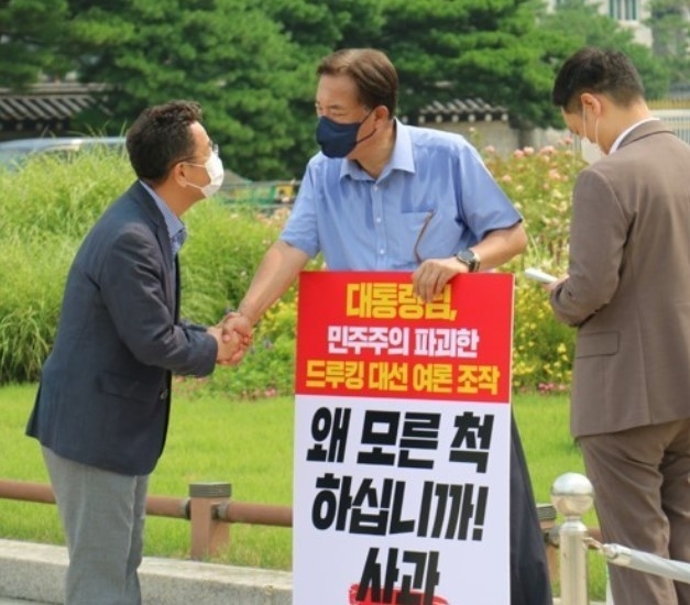 이철희 청와대 정무수석은 29일 오전 문 대통령의 사과를 요구하며 청와대 앞 분수대 광장에서 1인 시위를 벌인 국민의힘 정진석 의원을 만난 자리에서 "대통령은 (드루킹을) 몰랐을 것이다"라고 발언.