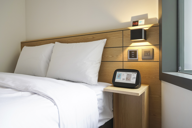 KT는 새롭게 개편된 UI/UX를 적용한 '기가지니 호텔 미니' 단말을 통해 음성 명령을 바탕으로 헨나호텔 서울 명동의 객실 내 언택트 서비스를 책임진다.