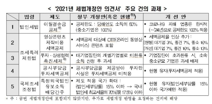 한경연이 건의한 주요 내용은 코로나19 피해업종 법인세 이월결손금 공제 한도 확대, 특정외국법인 유보소득 배당간주제도 적용 국가 기준(법인세부담률 15%) 유지, 영상콘텐츠 제작비용 세액공제율 상향, 투자·상생협력 촉진세제 합리화, 공사부담금 투자세액공제 적용 유지 등이다.