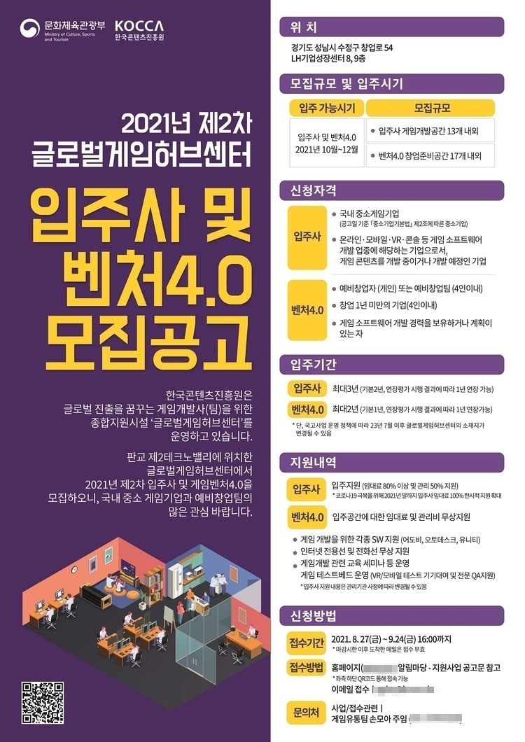 【 청년일보 】 문화체육관광부와 한국콘텐츠진흥원은 2021년 하반기 글로벌게임허브센터 입주사와 게임벤처4.0 신규·예비 창업팀을 총 30곳 내외로 모집한다.