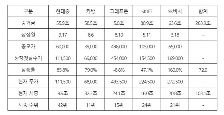 카카오뱅크 32조3천억원을 비롯해 크래프톤 24조1천억원, SK바이오사이언스 20조8천억원, SKIET 16조원 등이다. 현대중공업은 9조9천억원으로 10조원에 육박했다.