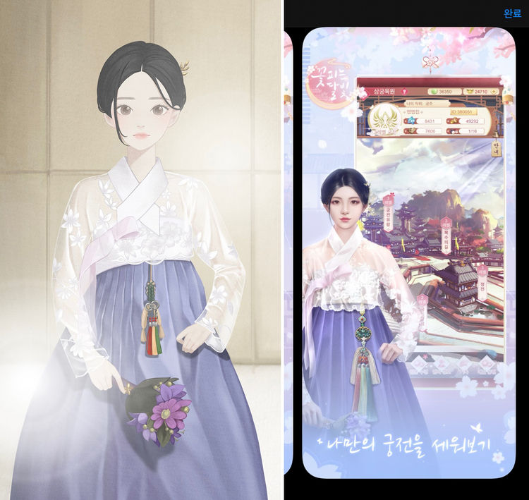 중국 게임사 Zishi Technology limited에서 서비스하는 시뮬레이션 게임 '꽃피는 달빛'이 국내 게임사 에어캡의 모바일 드레스업 게임 '걸 글로브'의 한복 브랜드 세트를 무단 도용한 사실이 확인.