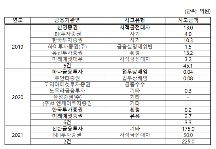 올해 2월에는 신한금융투자에서 해외비상장주식신탁 관련 175억 원의 대형 금융사고가 발생. 김 의원은 지난 2016년 이후 증권사에서 처음으로 100억 원이 넘는 금융사고가 발생한 것이라고 전함. 신한금융투자에 따르면 자체 감사 후 관련자 징계 조치 및 사고금액을 전액 반환한 것으로 전해짐.